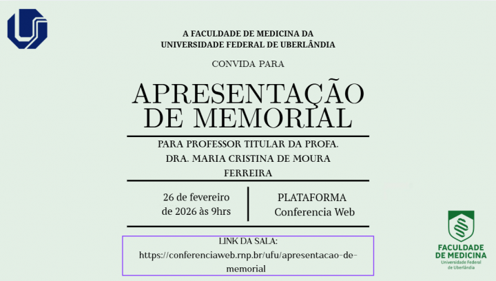 A Faculdade de Medicina da Universidade Federal de Uberlândia tem a satisfação de convidar todos(as) para a solenidade da defesa pública de Memorial descritivo para Professor Titular da Profª. Dra.  Grazieli Benedetti Pascoal, dia 26 de fevereiro de 2026, quinta-feira, às 09 horas que será realizada na modalidade remota, pela Plataforma ConferênciaWeb, através do link: https://conferenciaweb.rnp.br/ufu/defesa-de-memorial