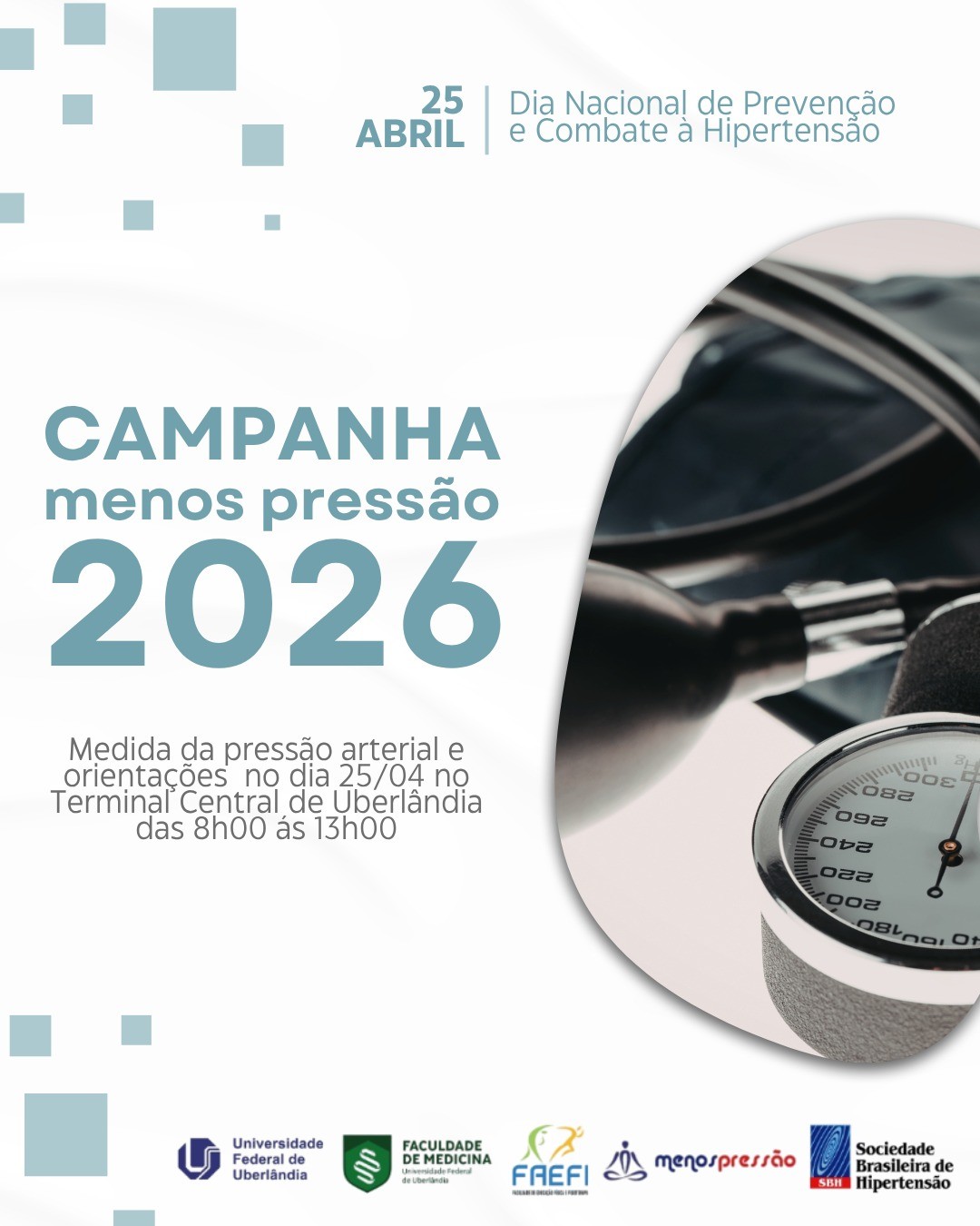 No dia 25 de abril de 2026, em alusão ao Dia Nacional de Prevenção e Combate à Hipertensão Arterial, será realizada, em Uberlândia (MG), a Campanha Menos Pressão, iniciativa nacional promovida pela Sociedade Brasileira de Hipertensão (SBH).