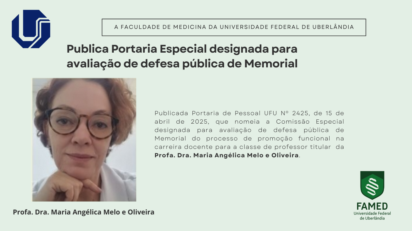 Informamos que foi publicada a Portaria de Pessoal UFU Nº 2425, de 15 de abril de 2025, que nomeia a Comissão Especial responsável pela avaliação da defesa pública do Memorial no âmbito do processo de promoção funcional na carreira docente para a classe de Professor Titular da Profa. Dra. Maria Angélica Melo e Oliveira.