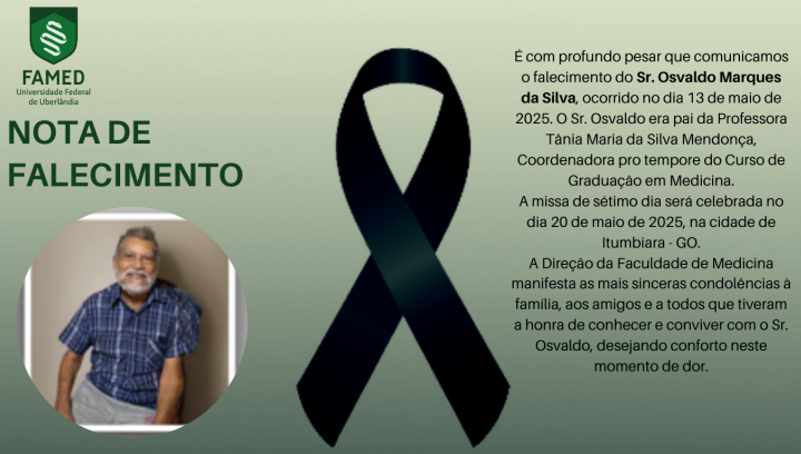 É com profundo pesar que comunicamos o falecimento do Sr. Osvaldo Marques da Silva, ocorrido no dia 13 de maio de 2025. O Sr. Osvaldo era pai da Professora Tânia Maria da Silva Mendonça, Coordenadora pro tempore do Curso de Graduação em Medicina.