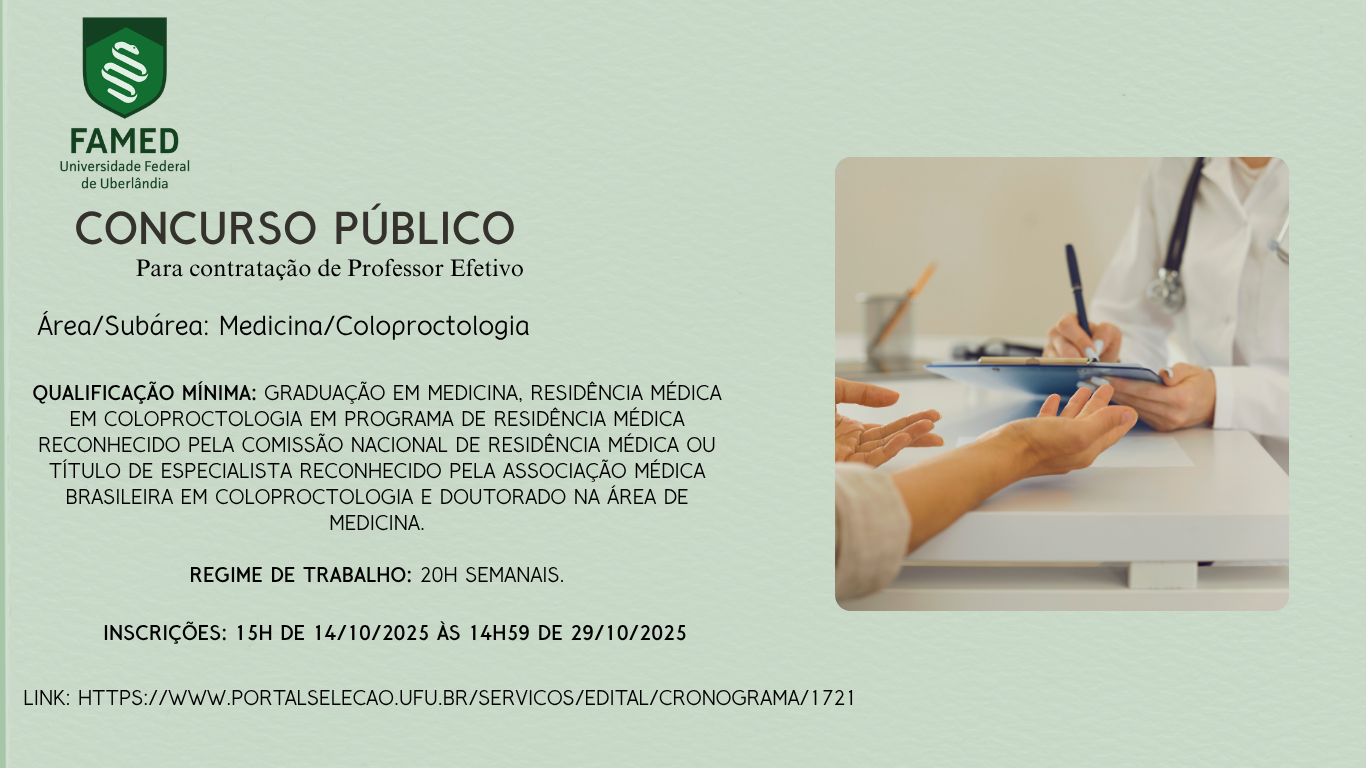 O Pró-Reitor de Gestão de Pessoas da Universidade Federal de Uberlândia, no uso de suas atribuições e considerando a delegação de competência que lhe foi outorgada por meio da Portaria UFU nº 166, de 07 de janeiro de 2025, do Reitor da Universidade Federal de Uberlândia, publicada no Diário Oficial da União em 08 de janeiro de 2025, seção 2, p. 34; e tendo em vista o que estabelecem a Lei nº 8.112, de 11 de dezembro de 1990; a Lei nº 12.772, de 28 de dezembro de 2012; bem como o Decreto nº 7.485, de 18 de maio de 2011, alterado pela Portaria Interministerial nº 316, de 9 de outubro de 2017; e o Decreto nº 8.260, de 29 de maio de 2014; o Decreto nº 9.739, de 28 de março de 2019; o Estatuto e o Regimento Geral da UFU; a Resolução CONDIR nº 2, de 22 de fevereiro de 2021; e demais legislações pertinentes, torna públicas as especificações do concurso público para contratação de professor(a) efetivo(a), conforme Edital PROGEP nº 174/2025.