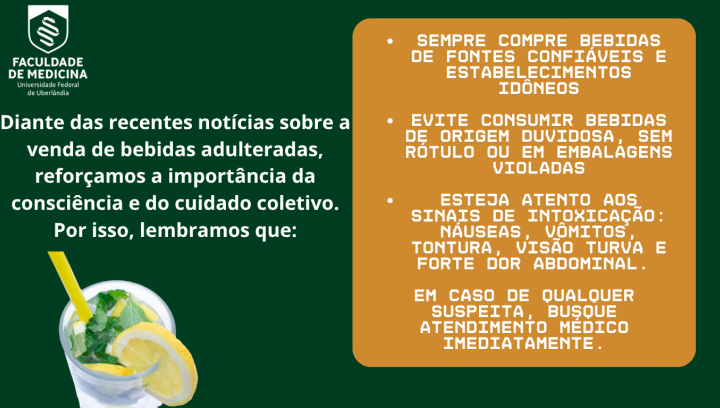 A Direção da Faculdade de Medicina vem por meio deste comunicado manifestar sua preocupação e emitir um alerta importante sobre os riscos associados ao consumo de bebidas alcoólicas, especialmente durante o período de recepção aos calouros e calouras.