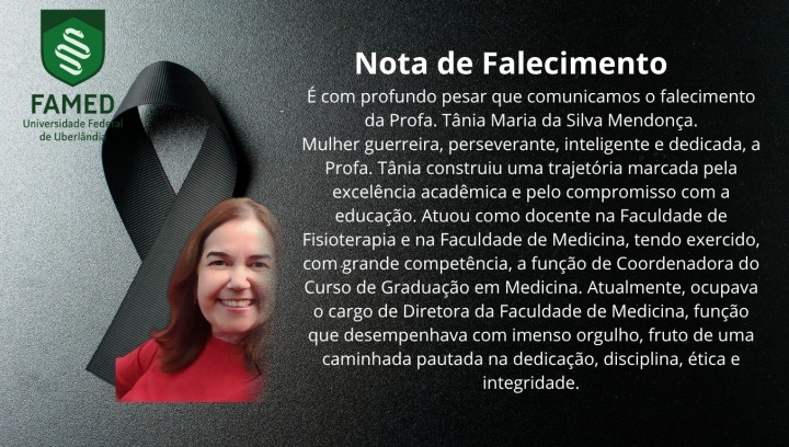 Mulher guerreira, perseverante, inteligente e dedicada, a Profa. Tânia construiu uma trajetória marcada pela excelência acadêmica e pelo compromisso com a educação. Atuou como docente na Faculdade de Fisioterapia e na Faculdade de Medicina, tendo exercido, com grande competência, a função de Coordenadora do Curso de Graduação em Medicina. Atualmente, ocupava o cargo de Diretora da Faculdade de Medicina, função que desempenhava com imenso orgulho, fruto de uma caminhada pautada na dedicação, disciplina, ética e integridade.