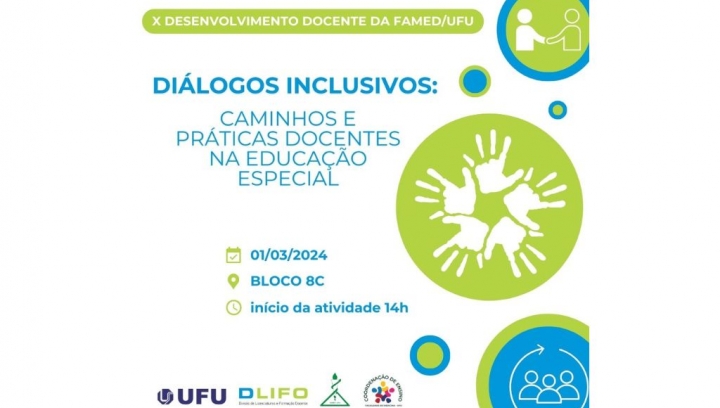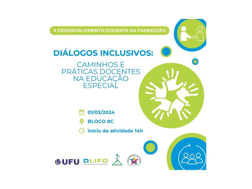 É com grande alegria que o(a) convidamos para o X Desenvolvimento Docente da FAMED - 2023.2, cujo tema será "Diálogos inclusivos: caminhos e práticas docentes na educação especial". O evento contará com a participação da Diretoria de Licenciatura e Formação Docente (DLIFO) da UFU.