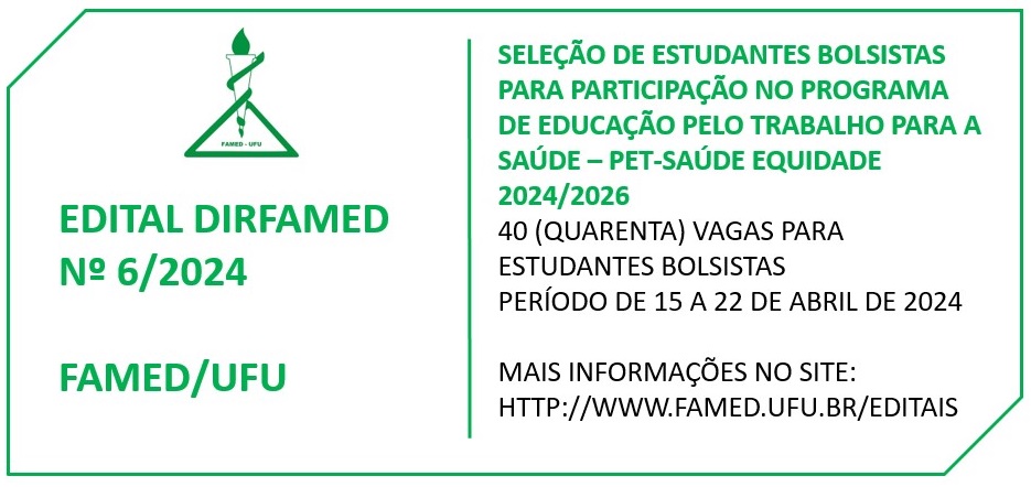 A Faculdade de Medicina da Universidade Federal de Uberlândia, em parceria com a Prefeitura Municipal de Araguari-MG, informa que encontram-se abertas, no período de 15 a 22 de abril de 2024, as inscrições para seleção de estudantes bolsistas, para atuar no projeto “Equidade e valorização das trabalhadoras e futuras trabalhadoras no SUS: transformação do cuidado a partir da integração ensino-serviço-comunidade” do Programa de Educação pelo Trabalho para Saúde (PET-Saúde Equidade), em conformidade com o Edital SGTES/MS nº 11, de 16 de novembro de 2023.