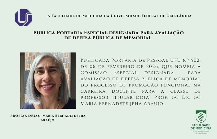 Informamos que foi publicada a Portaria de Pessoal UFU Nº 502, de 06 de fevereiro de 2026, que nomeia a Comissão Especial responsável pela avaliação da defesa pública do Memorial no âmbito do processo de promoção funcional na carreira docente para a classe de Professor Titular da Profa. Dra. Maria Bernadete Jeha Araújo.