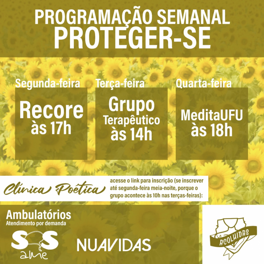 O Projeto Proteger-se está oferecendo atendimento terapêutico on-line gratuito para toda a comunidade da Universidade Federal de Uberlândia (UFU). São mais de 60 profissionais da área de saúde da instituição envolvidos na ação, incluindo diversas unidades acadêmicas e administrativas da universidade, além de parcerias para os casos que precisarem de encaminhamento.