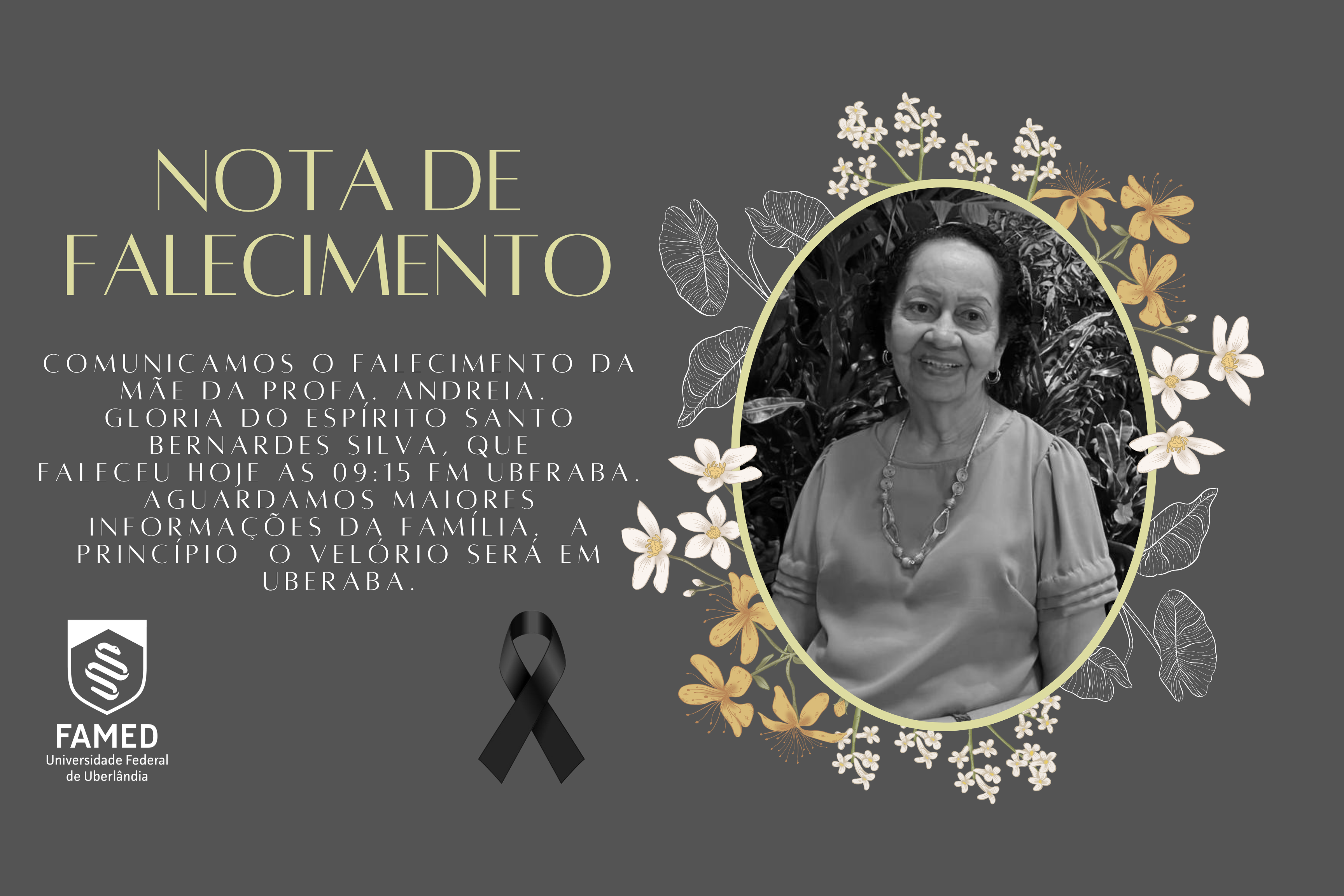 Comunicamos o falecimento da mãe da profa. Andreia. Gloria do Espírito Santo Bernardes Silva, que faleceu hoje as 09:15 em Uberaba. Aguardamos maiores informações da Família. A princípio o velório será em Uberaba.