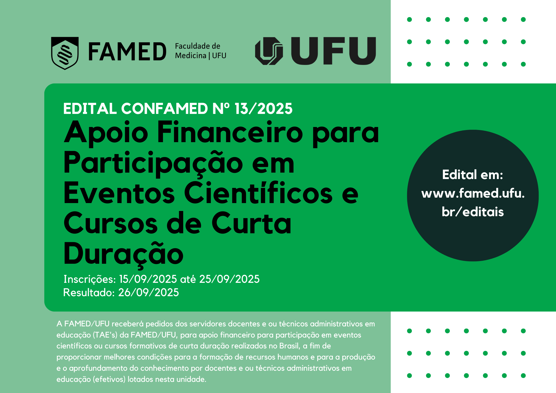 A FACULDADE DE MEDICINA DA UNIVERISIDADE FEDERAL DE UBERLÂNDIA (FAMED/UFU), no uso de suas atribuições legais, torna público o Edital para apoio financeiro para participação em eventos científicos ou cursos formativos de curta duração realizados no Brasil, a fim de proporcionar melhores condições para a formação de recursos humanos e para a produção e o aprofundamento do conhecimento por docentes e técnicos administrativos em educação (efetivos) lotados na FAMED/UFU.