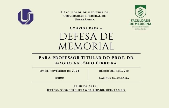 A Faculdade de Medicina da Universidade Federal de Uberlândia tem a satisfação de convidar todos(as) para a solenidade da defesa pública de Memorial descritivo para Professor Titular do Prof. Dr. Magno Antônio Ferreira, dia 29 de novembro de 2024, sexta-feira, às 10 horas, que será realizada na formato hibrido, no Bloco 2E, Sala 210 - Campus Umuarama, e pela Plataforma ConferênciaWeb, através do link: https://conferenciaweb.rnp.br/ufu/famed