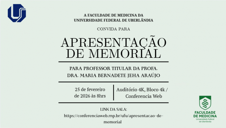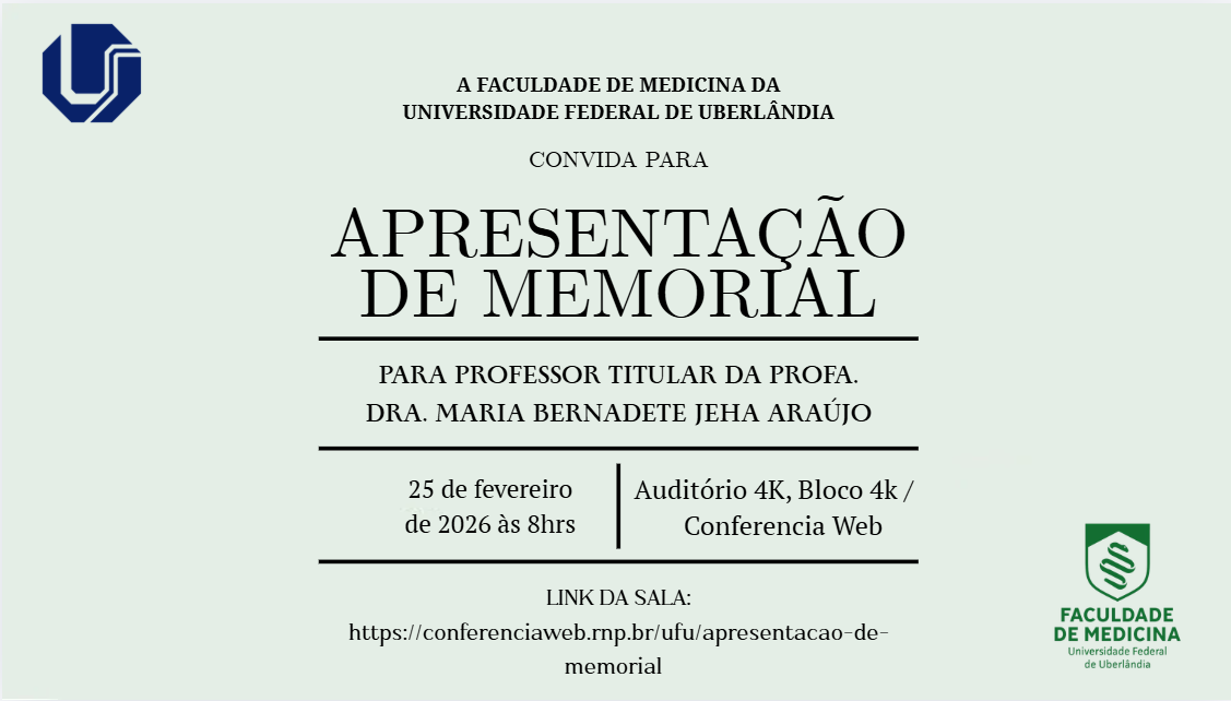 A Faculdade de Medicina da Universidade Federal de Uberlândia tem a satisfação de convidar todos(as) para a solenidade da defesa pública de Memorial descritivo para Professor Titular da Profª. Dra. Grazieli Benedetti Pascoal, dia 25 de fevereiro de 2026, quinta-feira, às 08 horas que será realizada na modalidade remota, pela Plataforma ConferênciaWeb, através do link: https://conferenciaweb.rnp.br/ufu/defesa-de-memorial