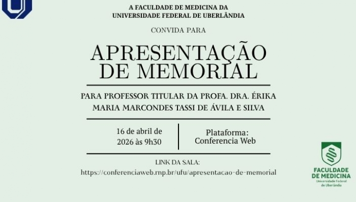 A Faculdade de Medicina da Universidade Federal de Uberlândia tem a satisfação de convidar todos(as) para a solenidade da defesa pública de Memorial descritivo para Professor Titular da Profª. Dra. Érika Maria Marcondes Tassi de Ávila e Silva, dia 16 de abril de 2026, às 09 horas e 30 minutos, a ser realizada na modalidade remota, pela Plataforma ConferênciaWeb, através do link: conferenciaweb.rnp.br/ufu/apresentacao-de-memorial