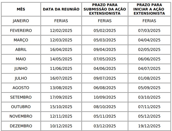 ATENÇÃO: As ações de extensão devem ser registradas no SIEX para avaliação de acordo com os prazos estabelecidos no CALENDÁRIO DE REUNIÕES ORDINÁRIAS COEXT 2025.